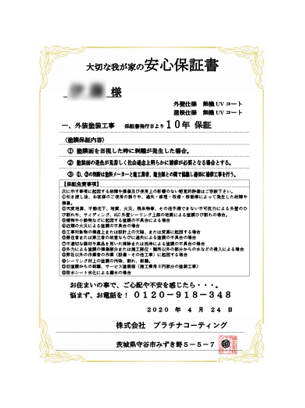 そのため、立地条件や工事の仕様により1年、3年、5年、7年、10年の5つの保証を用意しております。 この期間に不具合があれば無料で補修いたします。