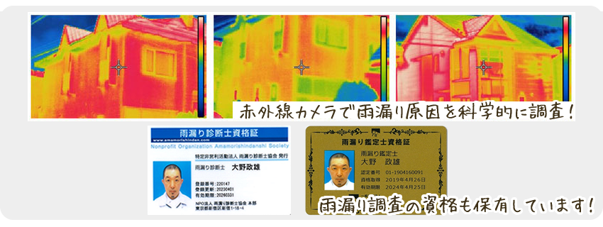 雨水の浸入箇所が複雑な場合もお任せください!散水調査や赤外線カメラを使った科学的な調査も可能です!