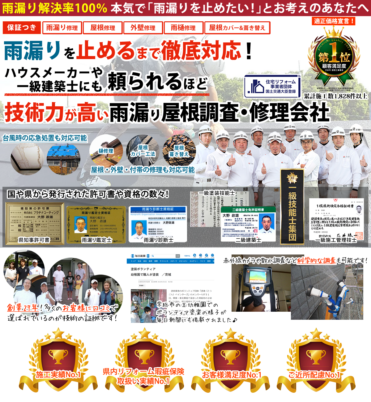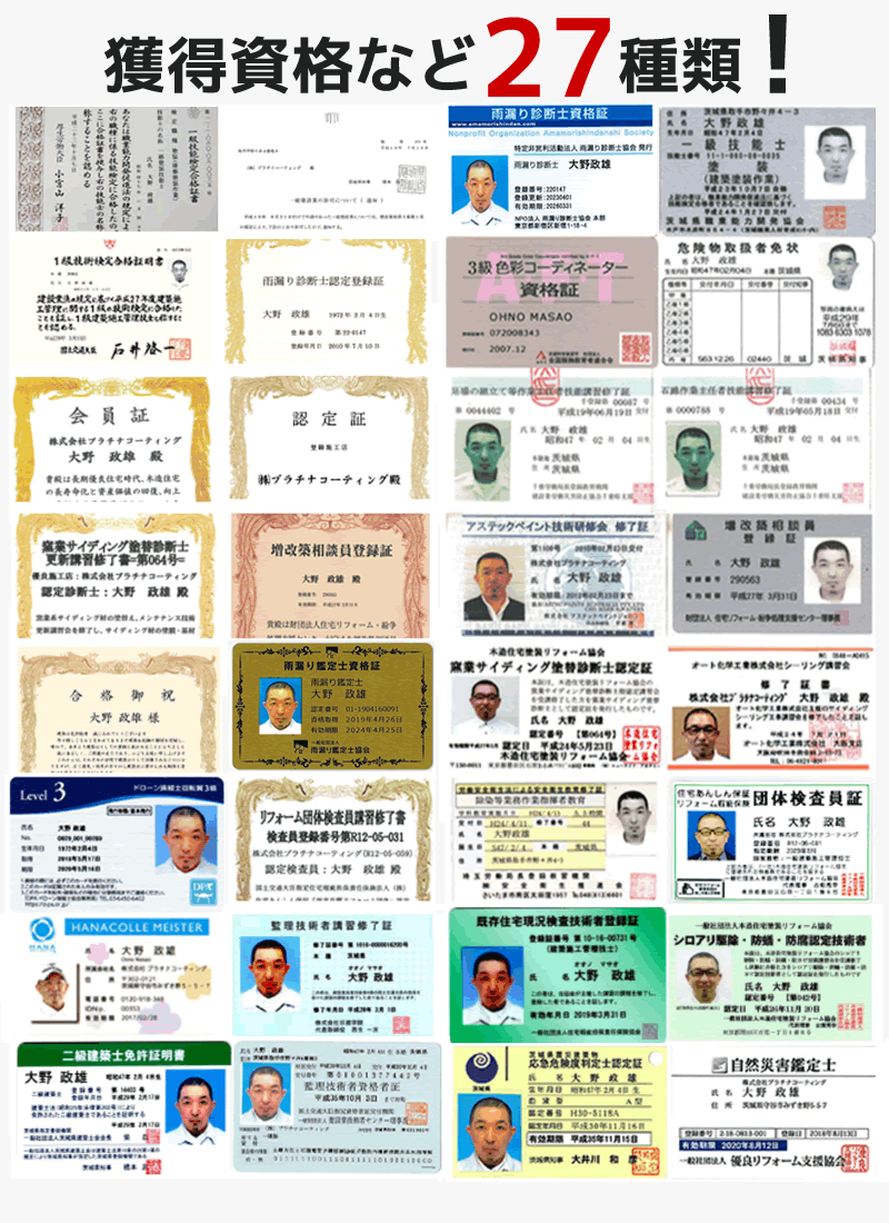 プラチナコーティングは、雨漏りをしっかり調査・補修するため、国や県などから発行された様々な資格を代表の私や自社社員が取得しています。