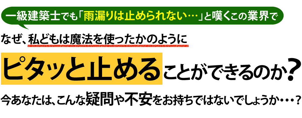 また、ハウスメーカーや一級建築士の方たちからも「何とか止めてほしい…」と依頼がくることもあります。それくらい雨漏りの補修は難しいのです。