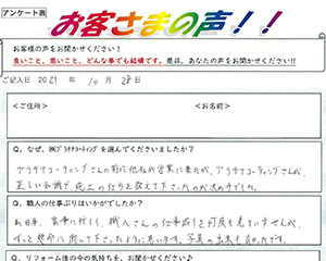 プラチナコーティングさんの前に他社が営業に来たが、プラチナさんが正しい知識で施工の仕方を教えて下さったのが決め手でした。