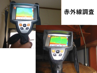 赤外線カメラ調査とは、温度によって色が変わる特殊なカメラを使った調査です。このカメラを使うと、科学的に建物の温度を計ることができ、雨漏り個所(温度の低い箇所)を特定できます。