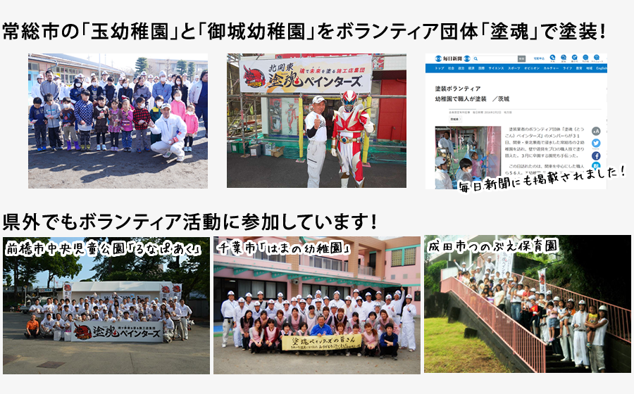 プラチナコーティングでは、「自分たちの技術を使い、何か世の中の手助けができないか」を考え、全国230社からなるボランティア団体「塗魂」に加盟しています。